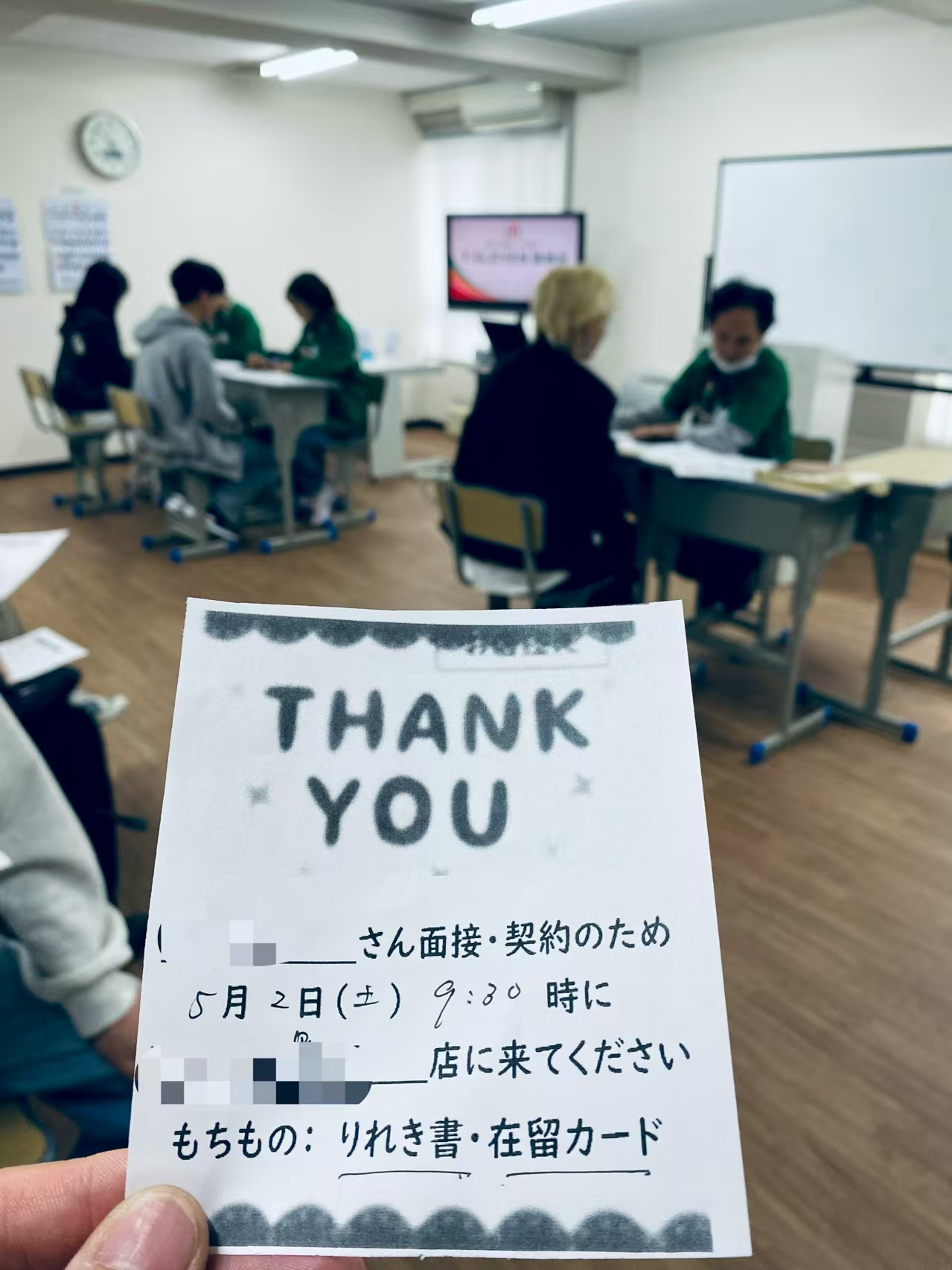 今回のイベントは、学校と企業が協力して留学生のアルバイトを支援する取り組みとして、とても心強いものでした。実際に働くチャンスが広がるだけでなく、日本での生活や将来のキャリアを考えるうえでも大きな一歩になったと感じます。